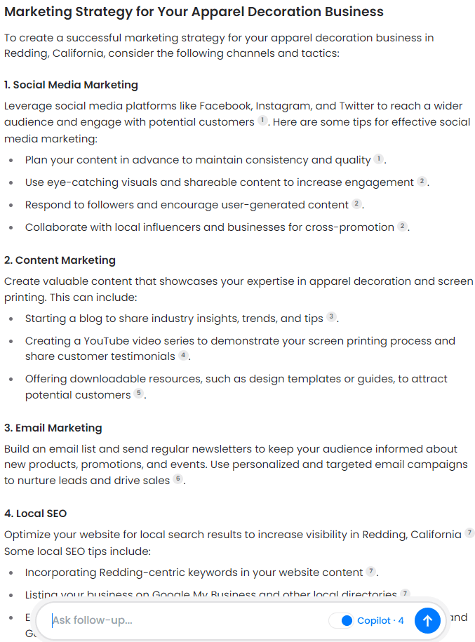 AI is also good at helping you craft a decent business strategy plan for your fledgling print shop. Your mileage may vary, but it’s still a helpful step forward. Consider the following example generated using Perplexity: