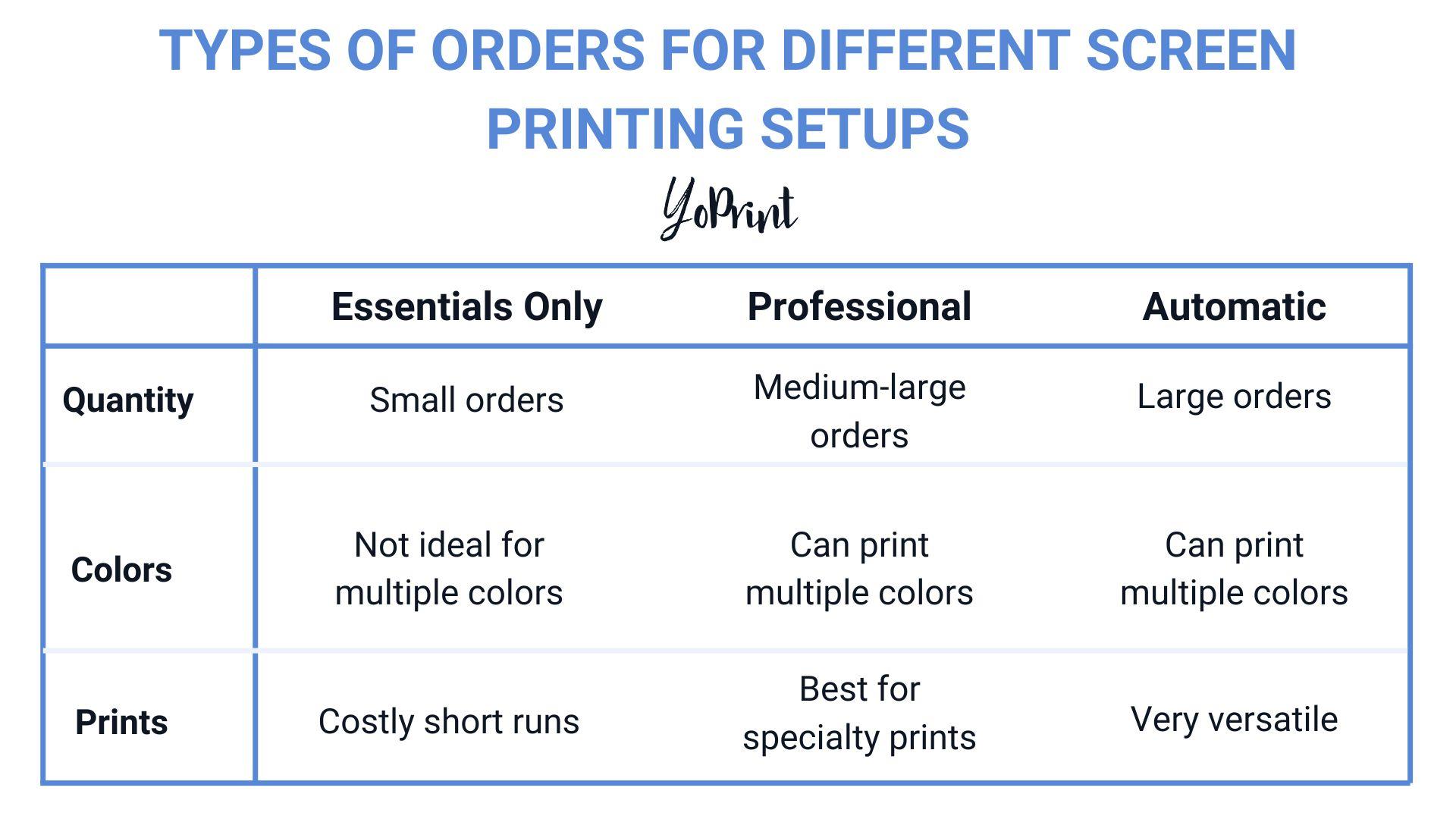 However, EO setups are meant for new screen printers and aren’t ideal for bigger printing orders. A good setup allows you to print faster, but you’ll still need additional tools and trained staff to fulfill larger orders. Moreover, multicolored jobs can take a significant amount of time owing to the additional required screens for each color. While it might be tempting to start with small print runs of under 30 shirts, the time and cost investment for such short runs will only cost you more than it will for bigger runs.