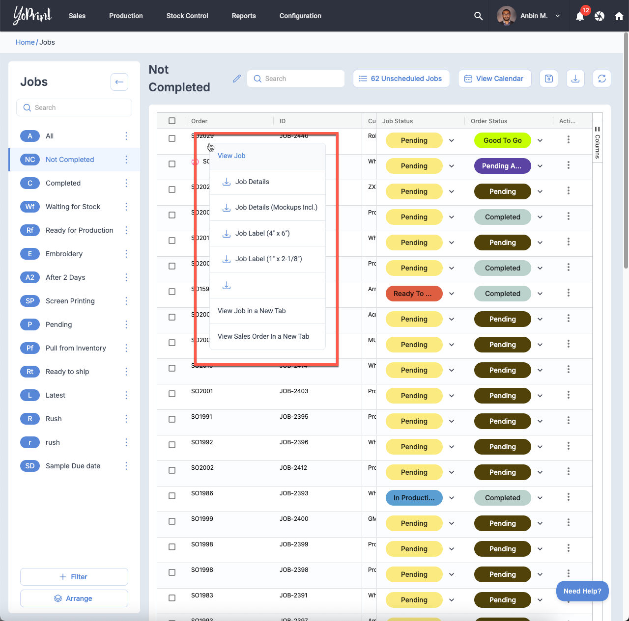 Job and pipeline calendars have been upgraded with month, week, and agenda views. Hovering over any event now shows a rich detail popover with customer info, dates, mockup images, production notes, and task lists. Popovers can be pinned and dragged for reference while you work elsewhere on the page.