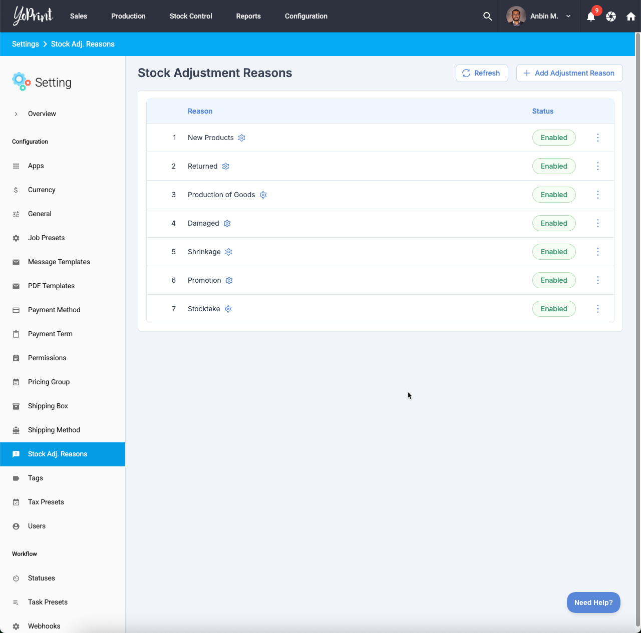 - Stock adjustment workflows with commit/receive lifecycle