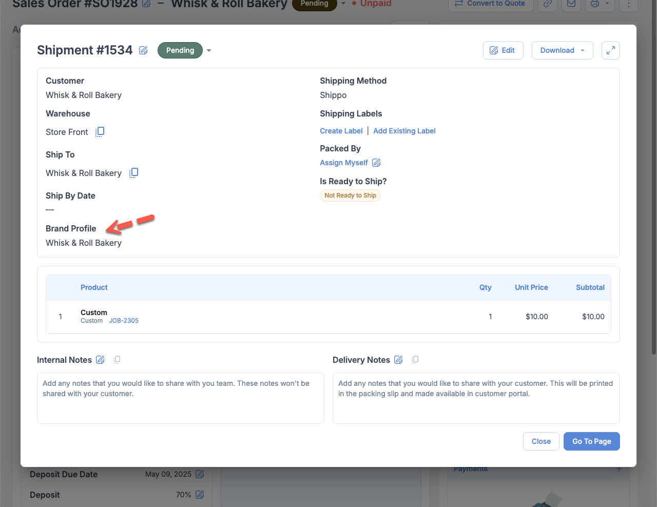 Shipment Detail Dialog: Add Brand Profile