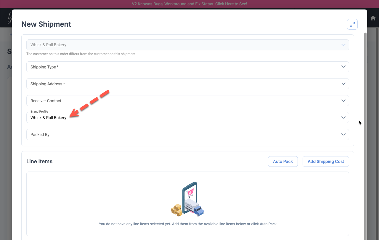 When starting a new shipment, we will automatically fill the "Brand Profile" field based what you have in Sales Order. This is great for drop ship customers since Shipments created will automatically be associated with the correct packing slips