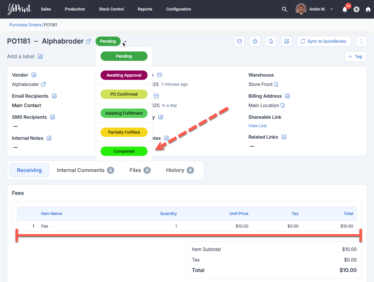 Right now, if a Purchase Order only has fees, you are unable to mark it as completed. This update fixes this issue.