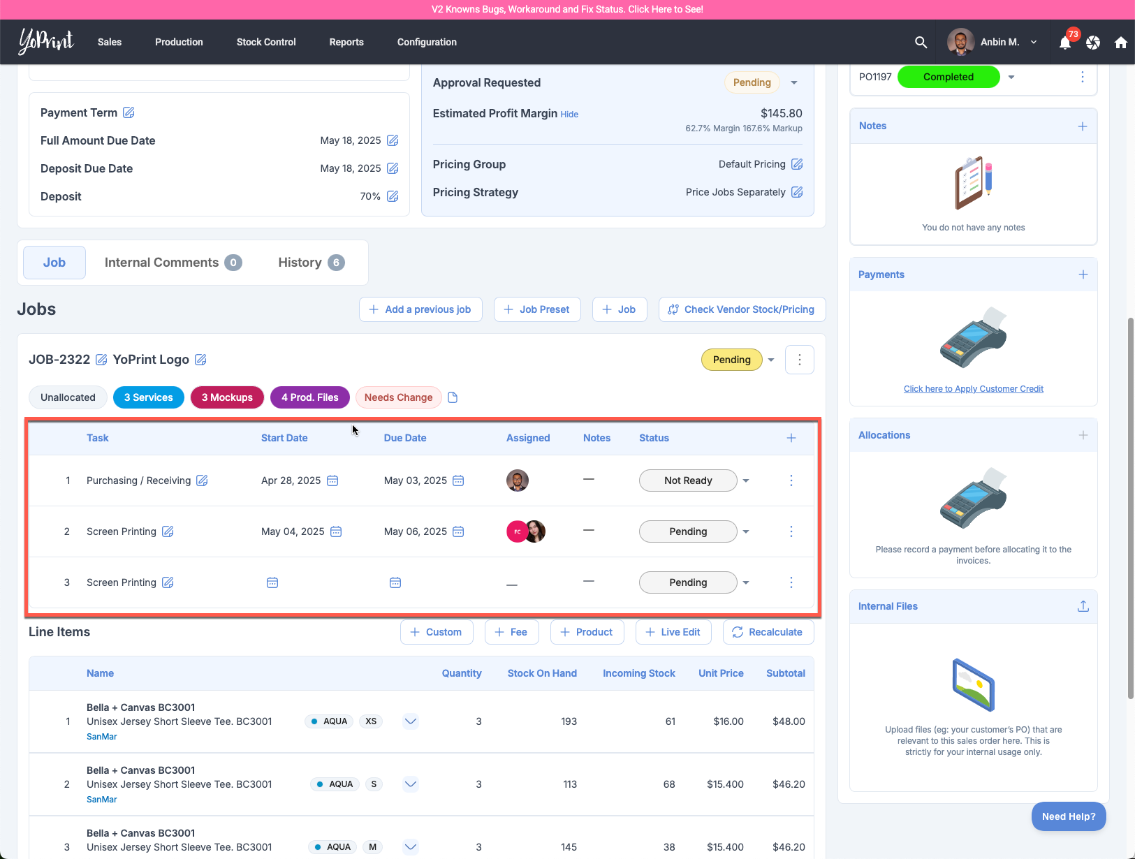 We had an issue where making changes to Sales Order Line Items is not correctly updating the inventory counts. This has now been fixed.