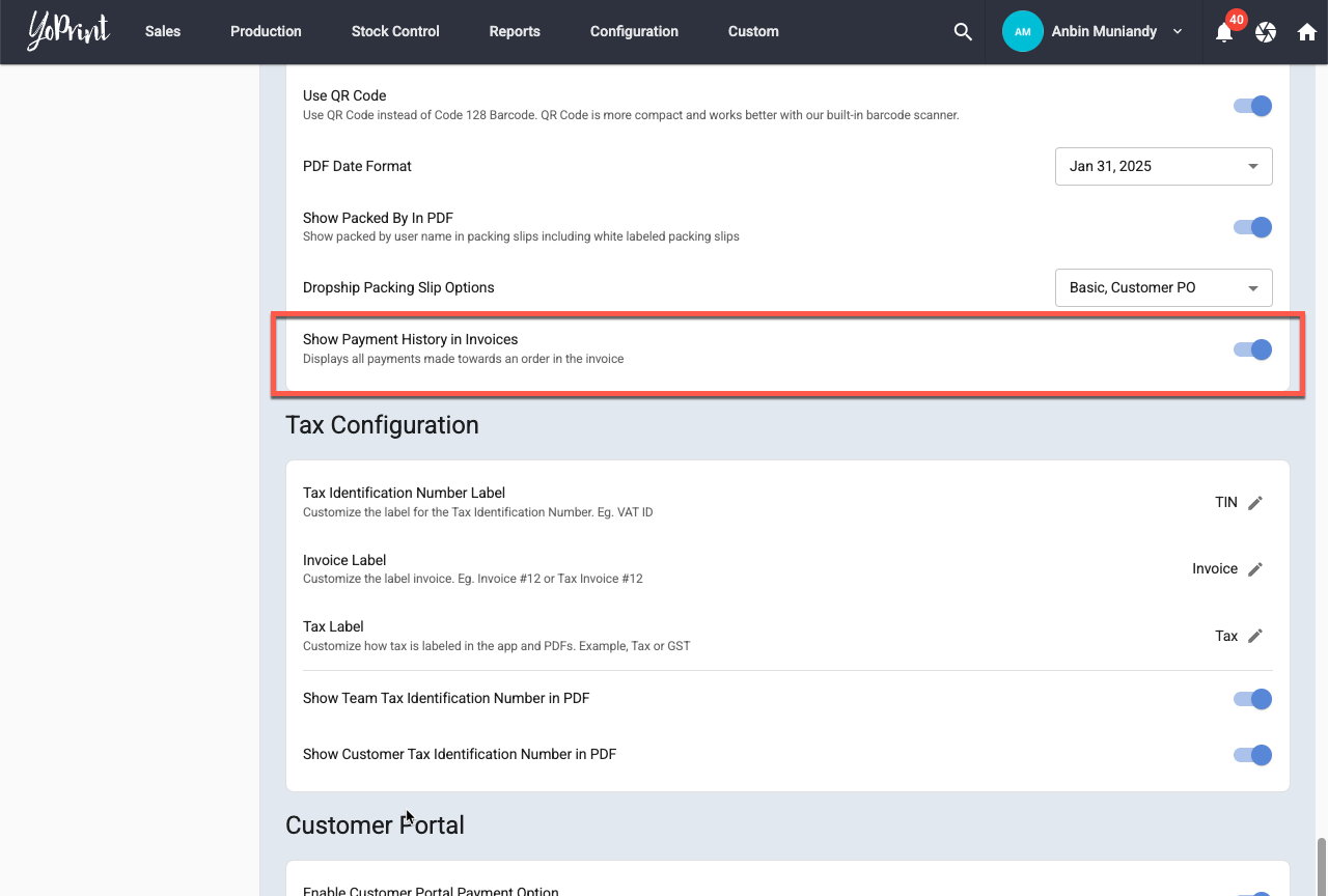 You can now display a list of payments made towards the order in the invoices. This is an opt-in feature which you need to enable it under Configuration > Settings > General. Scroll down to PDF Configuration and turn on Show Payment History In Invoices.