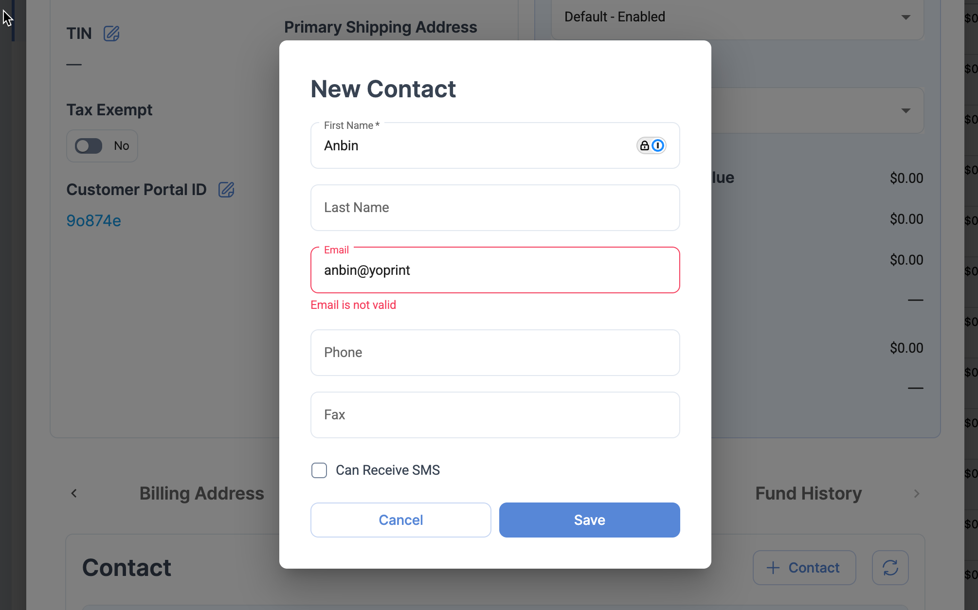 When creating a customer or contact, entering invalid email will result in operation failed without specifying the reason. We've now added UI validation to indicate if entered email is invalid.