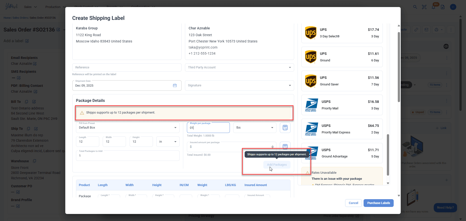 - Enforce a maximum of 12 packages per shipment in accordance with Shippo’s multi-package restrictions.