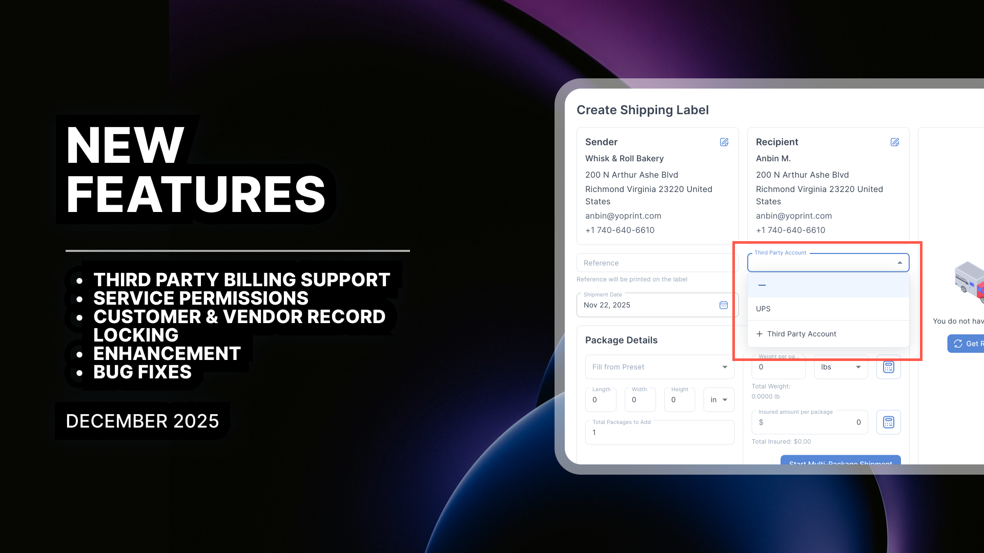Added support for UPS and FedEx third-party billing through Shippo. Customer shipping account information can now be saved and automatically applied when shipping to or on behalf of customers with their own carrier accounts.