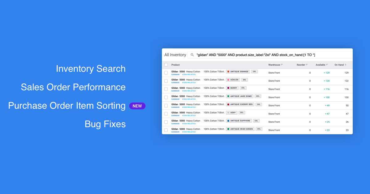 We’ve rolled out a new version of our indexing engine, making our already fast inventory search even faster. We’ve also added an entirely new way of searching for inventory. Now you can perform complex queries like, find me all Gildan 5000 products size 2xl that you currently have in stock. You can find a detailed write up on the search query syntax here.