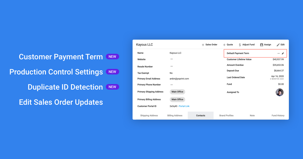 In addition to setting the default payment term for all your orders, you can specify the default payment term for each customer. We will automatically select the correct payment term whenever you create a new order/quote. Need to use a different payment term? Just override our selection. We believe this is going to make creating a new order faster than before.