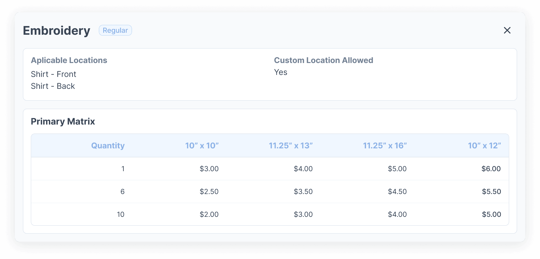 We know that print size dictates DTF pricing, so YoPrint's got pricing matrices that can be fully customized to different print sizes, as well as print location and quantity. Once it's set up, pricing is automatically calculated for all quotes - no more manual calculations necessary!